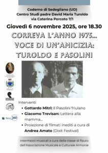 L’appuntamento è per giovedì 6 novembre 2025 alle ore 18.30 presso la casa natale di padre Turoldo a Coderno di Sedegliano.